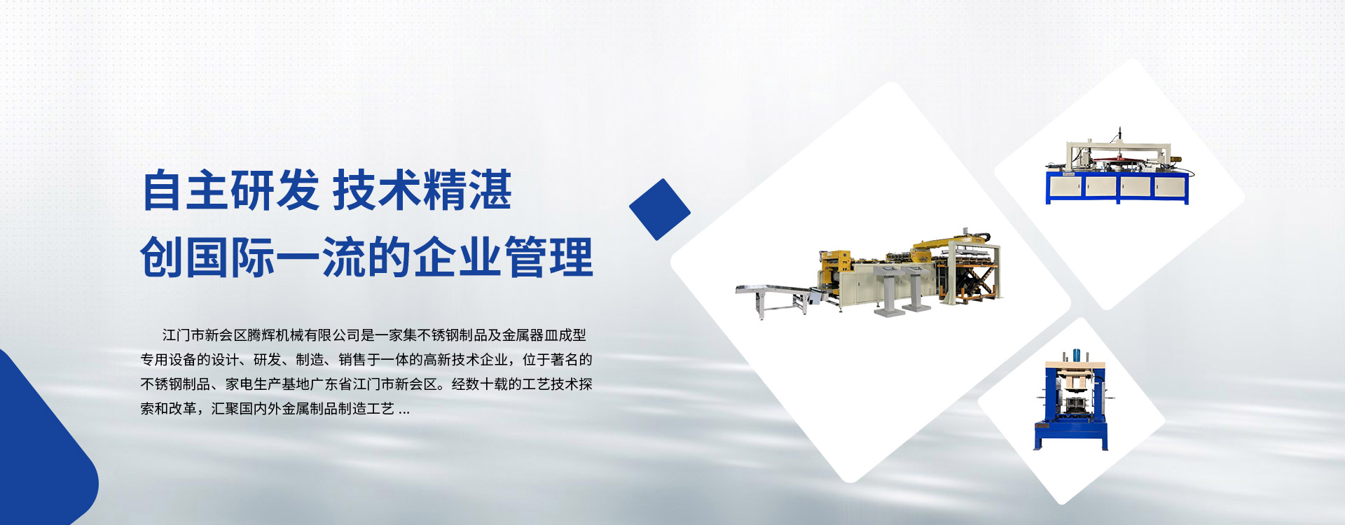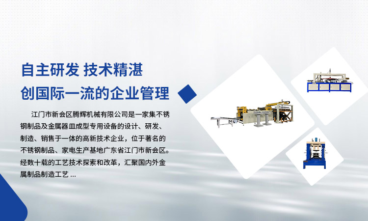 江門市新會區騰輝機械有限公司是一家集不銹鋼制品及金屬器皿成型專用設備的設計、研發(fā)、制造、銷售于一體的高新技術企業(yè),位于著名的不銹鋼制品、家電生產基地廣東省江門市新會區。經數十載的工藝技術探索和改革,匯聚國內外金屬制品制造工藝。